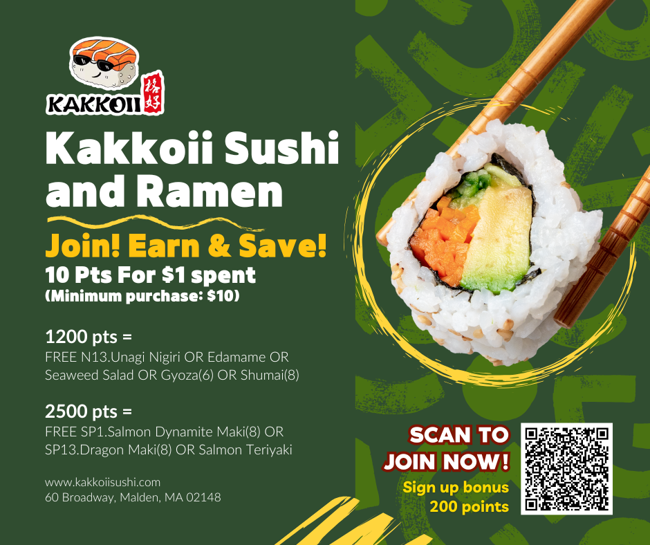 Welcome to Kakkoii Sushi and Ramen! Located at 60 Broadway, Malden, MA 02148, United States, this Japanese restaurant serves pure Japanese flavors. Enjoy fresh handcrafted sushi with rich textures, various rice bowls with savory ingredients, and rich ramen with a mellow broth—all worth a try.
